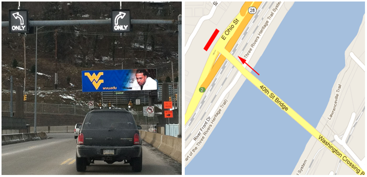 The image on the right is a map of the area — the red rectangle represents the billboard’s location. Add in ongoing construction — note the orange detour signs in the picture — and fog that can occur in the area since it’s over a river, and it’s a multiple-car accident waiting to happen.