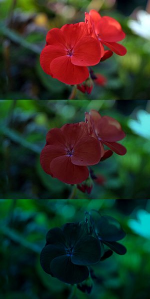 In other words, if you have a red light and a blue light of equal brightness, in bright conditions the red light will appear brighter. This is because our eyes are most sensitive to light from the warm end of the spectrum in bright conditions. But in low light, we become more sensitive to the cool end of the spectrum as our vision shifts from cones to rods. The end result is that our perception of the brightness of those two lights flips – in dark conditions the blue light appears brighter than the red. In the image to the right notice how the blue in the background becomes more prominent as the red fades with darkness.