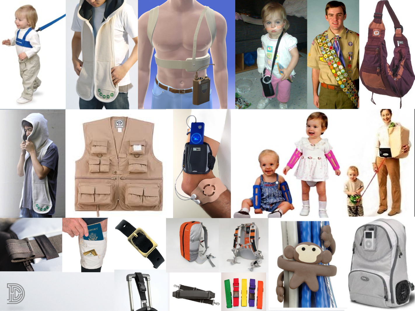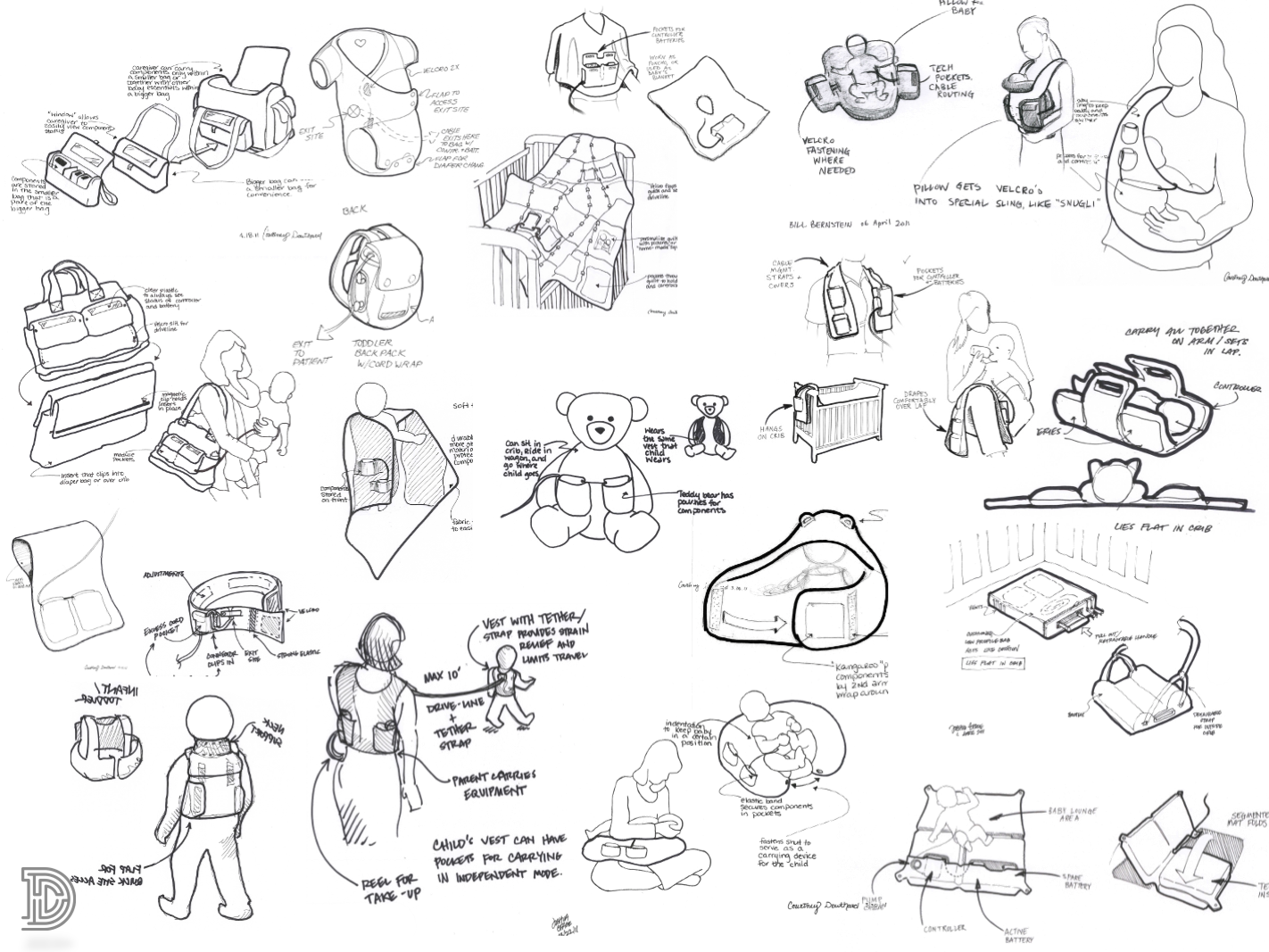 At the start of the session, we’ll offer a brief problem statement that is derived from the research, and will walk participants through our design criteria, sharing key observations and insights from the research that led to those. We will fill our space with inspiration images, in addition to key images from our research. For a design project related to a wearable medical device intended for small children, we filled our space with images that depicted the many ways that infants and toddlers move, ways in which they are carried or held by adults and by baby equipment (e.g. swings, cribs, play sets, etc), and ways in which other things are often worn or carried.